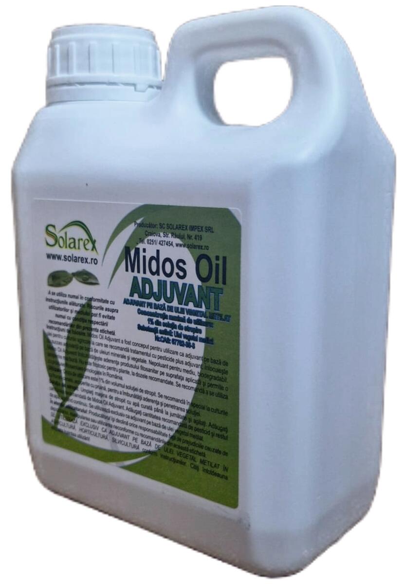 Instructions for use: Midos Oil Adjuvant has been designed for use as a methylated vegetable oil-based adjuvant for agricultural crops where pesticide treatment plus adjuvant is recommended. It successfully replaces mineral and vegetable oil-based adjuvants. Environmentally friendly, biodegradable. Midos Oil Adjuvant improves the adhesion of the crop protection product on the applied surface and allows better coverage. It is not phytotoxic to plants at recommended doses. It is recommended for use with plant protection products approved in Romania.
