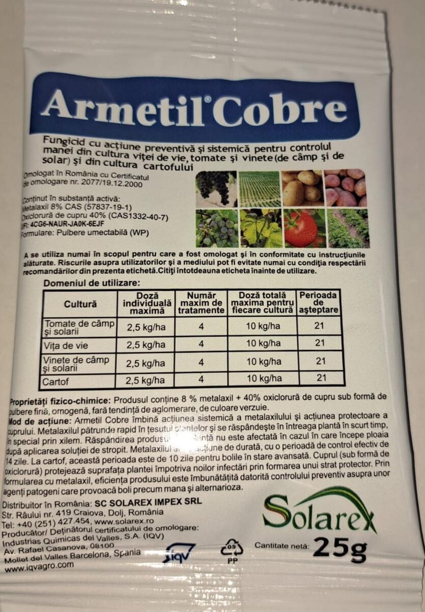 ARMETIL COBRE – 2,5 kg/ha ( 25g/10 l apa).