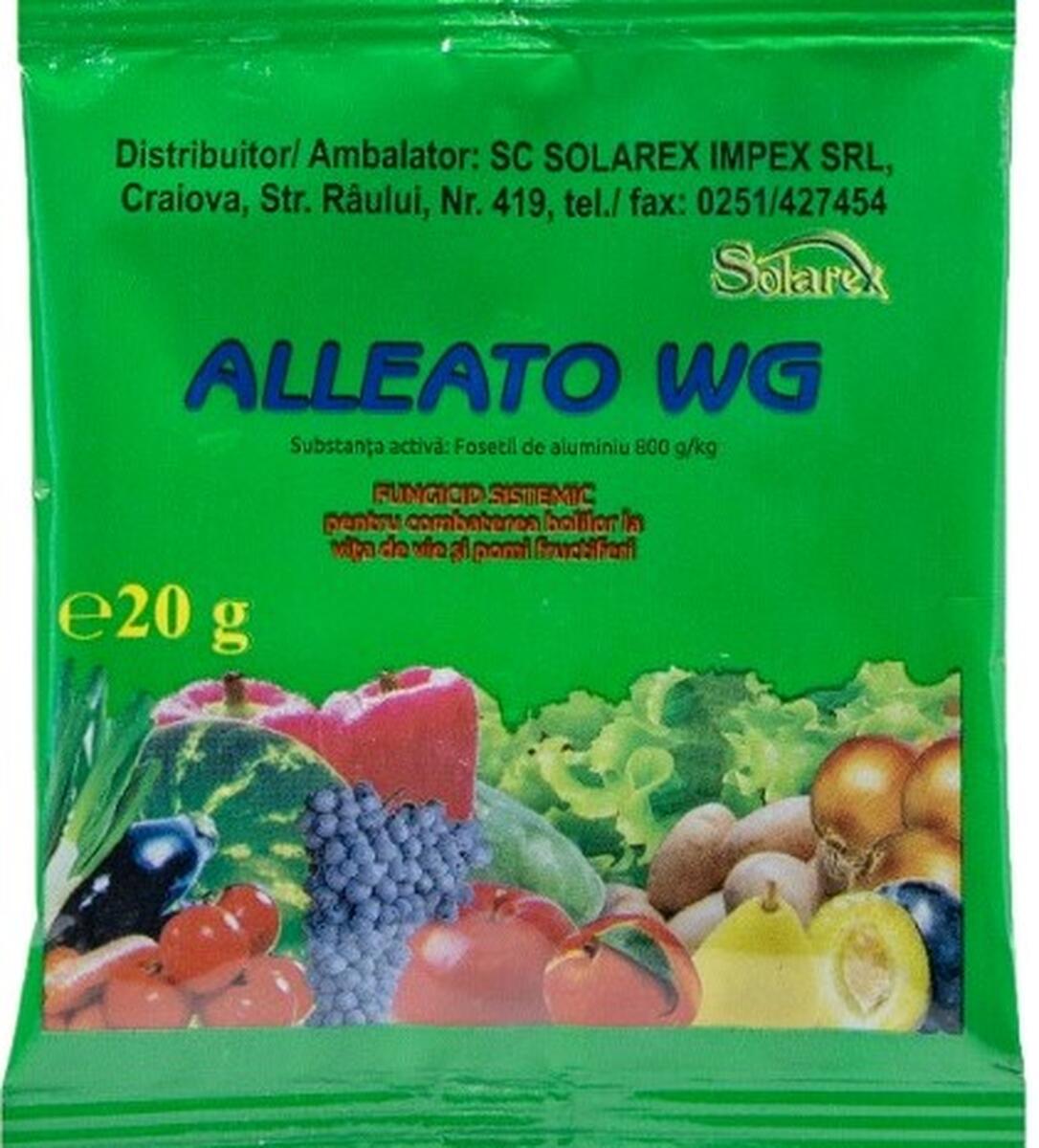 ALLEATO WG – 2,0 kg/ha ( 20 g/ 10 l apa ) – este un fungicid sistemic, pe baza de fosetil de aluminiu, cu mare capacitate de patrundere si mobilitate in tesuturi , protejaza atat cresterile tratate cat si pe cele nou aparute dupa tratament , are actiune preventiva si curativa.