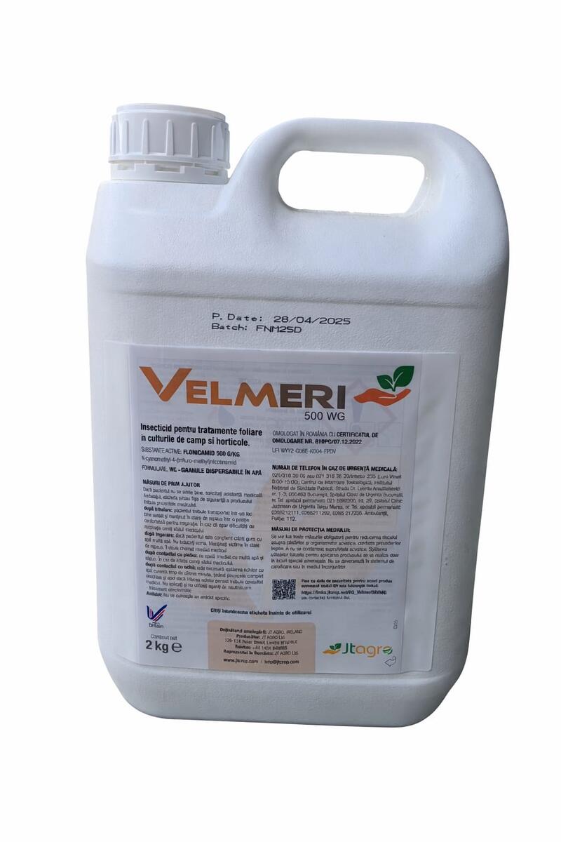 Mod de acţiune: VELMERI 500 WG este un aficid specific, utilizat pentru tratamente foliare în culturile de câmp şi horticole. Are actiune sistemică şi translaminară, pătrunde în plante prin frunze şi lăstari şi circulă acropetal. Poate fi absorbit şi din sol de către sistemul radicular şi translocat în organele superioare ale plantei. Asupra insectelor dăunătoare acţionează prin contact şi ingestie, determinând inhibarea hrănirii şi moartea prin inaniţie. VELMERI 500 WG acţionează atât asupra afidelor imature cât şi a celor adulte, iar eficacitatea sa nu este influenţată de temperaturile din momentul aplicării şi de intensitatea luminoasă.